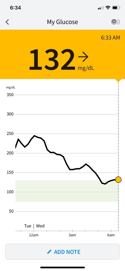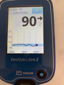 You want a concrete, personal example of what’s different for me? I aim to keep my glucose readings to stay from 80-120 mg/dL (The green stripe on the screen shot above). I work to keep it ‘between the lines’. It would be amazing if I could keep it at 80 mg/dL around the clock. But bodies, life and glucose don’t work that way. πŸ™‚ I took insulin and meds for years. Now I don’t. I would love to never, ever have to take any of them again. So, given that Type 2 Diabetes is largely a lifestyle disease – the results rest in large part on me and my day-by-day choices and habits. I use food and activity to control my health and stay out of the diabetic range. So for me, I try to move 6 days a week with sweat and intention. I try to keep my net carbs at/below 50 grams a day. THAT seems to be the sweet spot my body works at and responds to the best. I now know all of this life-changing information because I have a year of working with a CGM. The combination mentioned above is what gives me consistently good readings. πŸ™‚