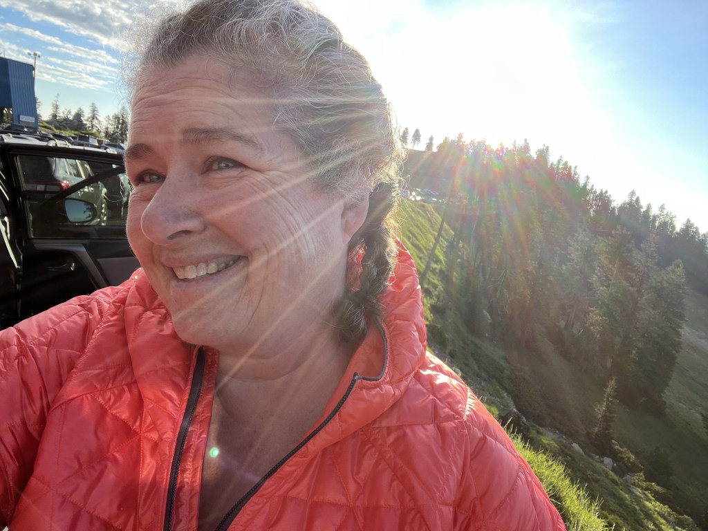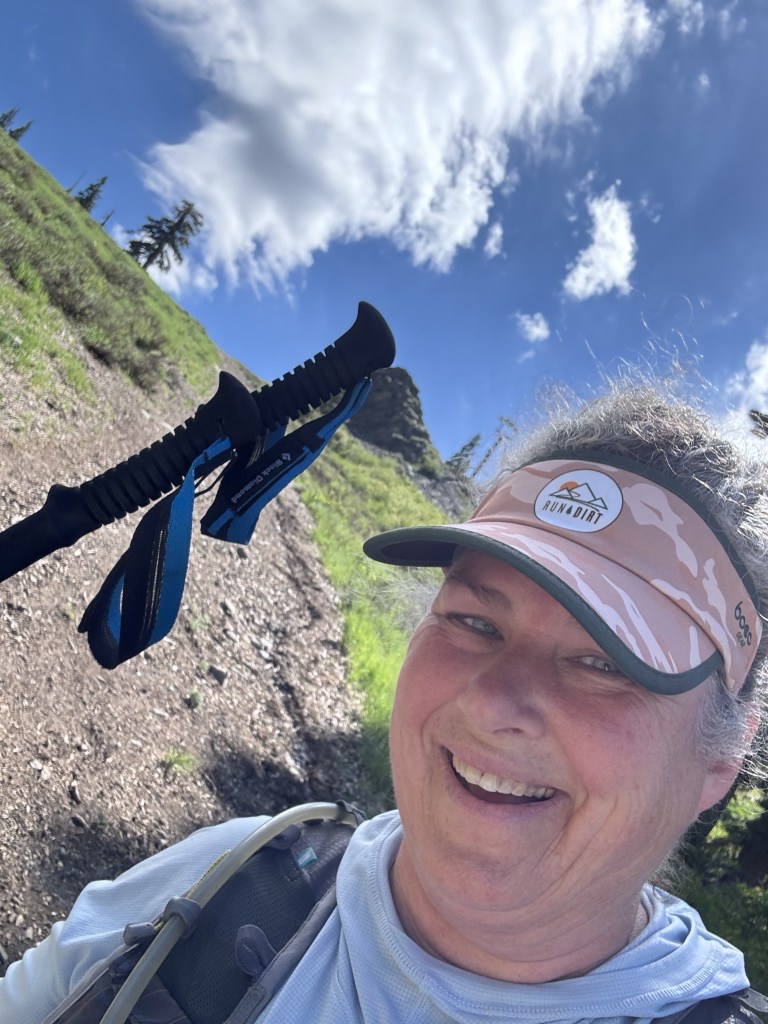 Using trekking poles and grinning ear to ear at being back in the mountains with my new hip! Yep, that hill behind me is STEEP.