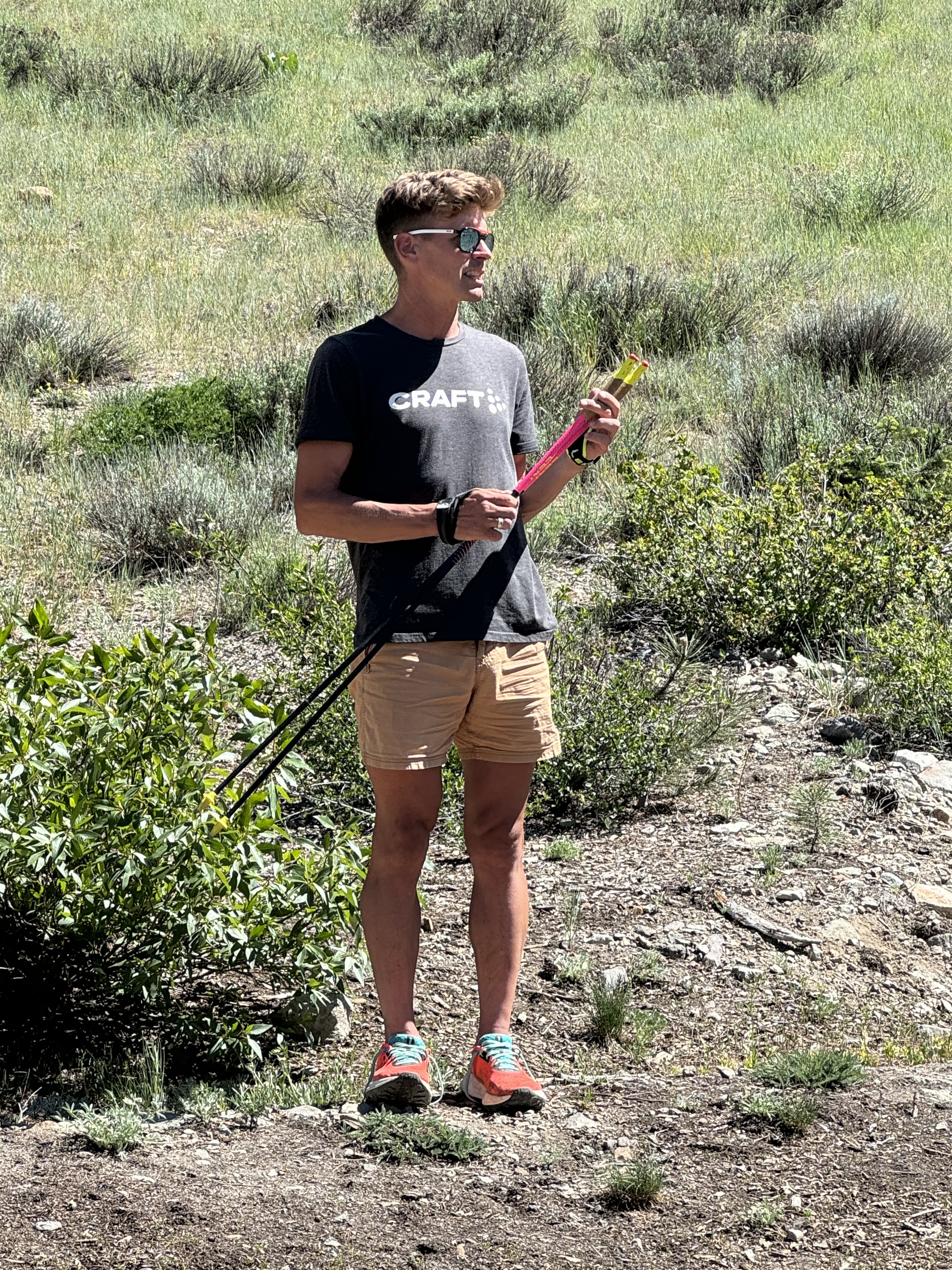 Tim Tollefson in Olympic Valley 2024, holding Leki Trekking/Racing poles